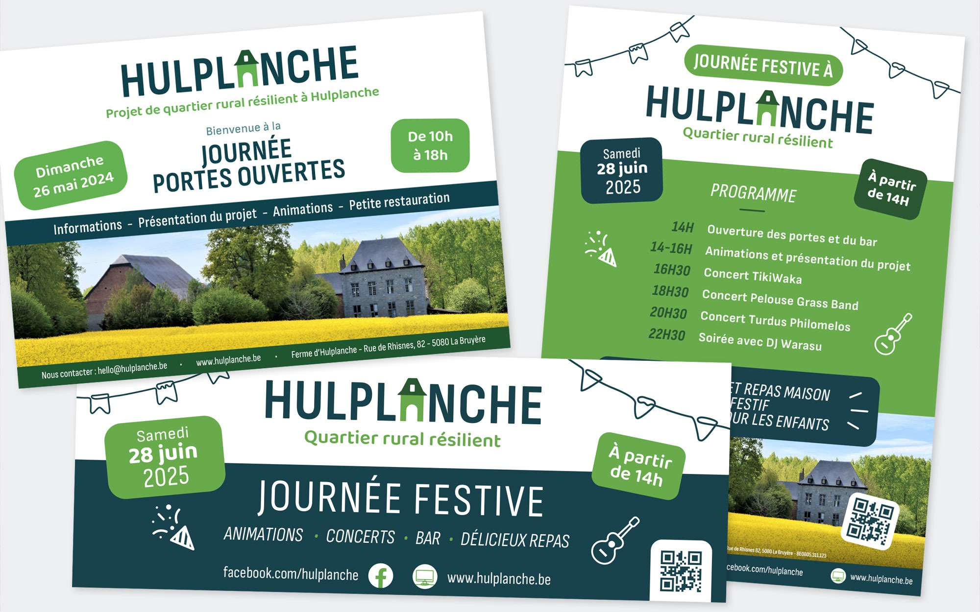 Le projet de quartier rural résilient Hulplanche voit le jour en 2024 et contacte BL-Graphics pour travailler ensemble. Une belle collaboration suivra et continue encore : Logo, charte graphique, visuels pour les réseaux sociaux, affiches, flyers, dépliant, bâches et bien sur site web !