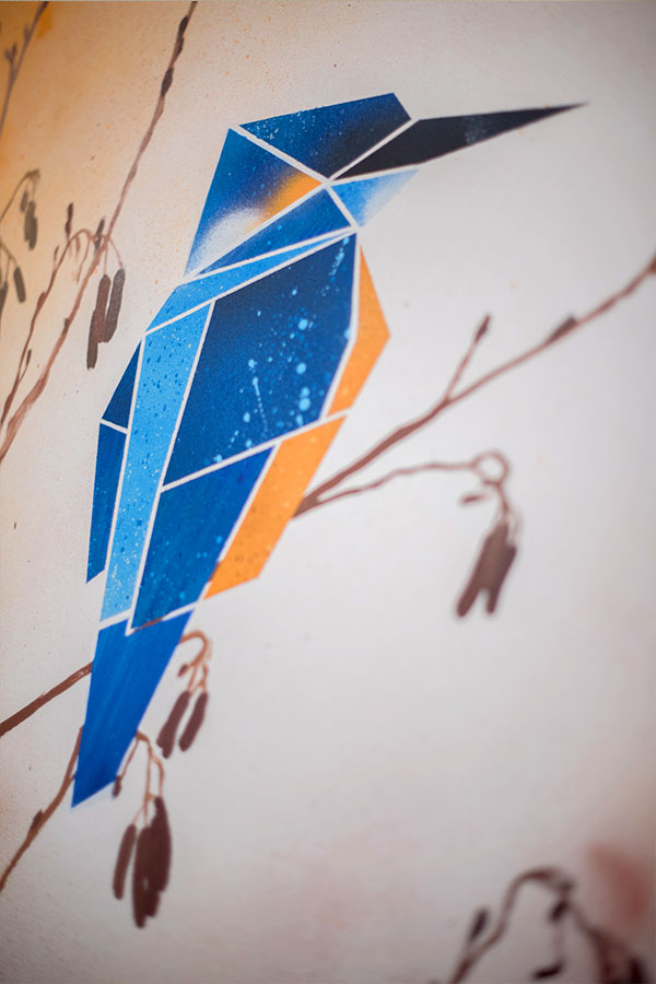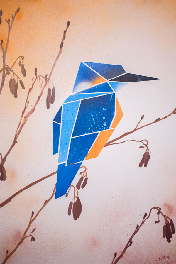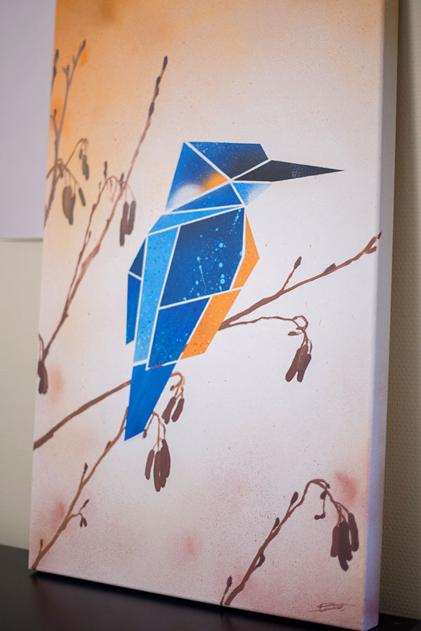 L’idée de la peinture Hummingbird est de représenter un colibri comme un origami simplifié, en gardant des textures et des contrastes dans les formes géométriques pour rappeler toute la subtilité du plumage du colibri. L’environnement a été peint de façon assez réaliste afin de contraster avec la représentation moderne et carrée de l’animal.