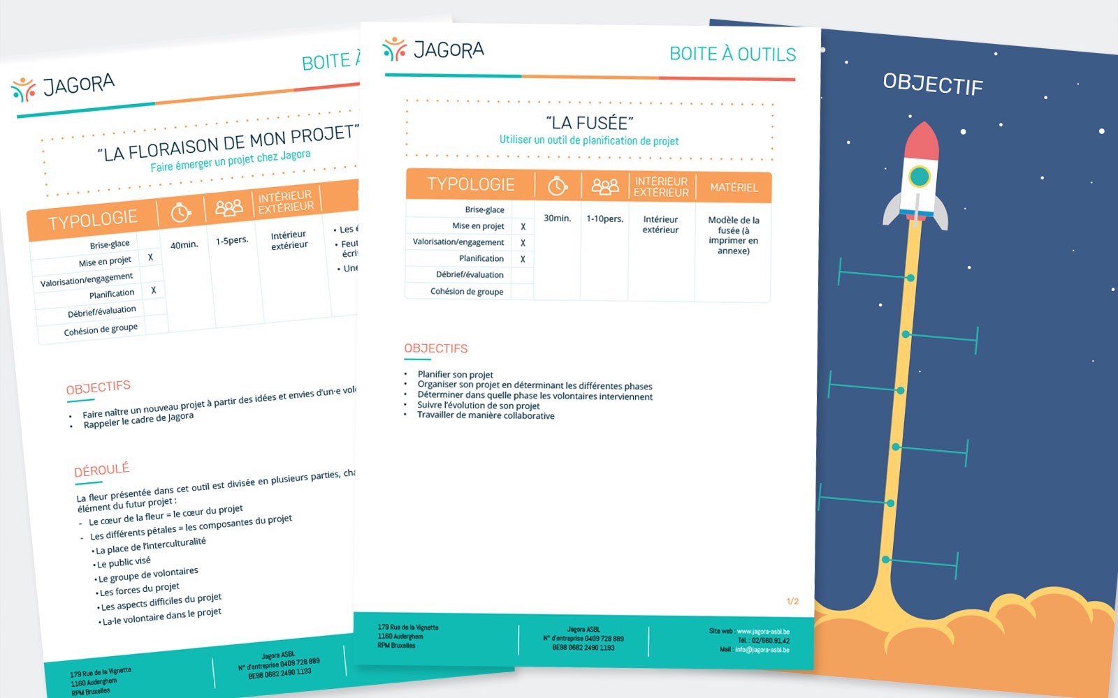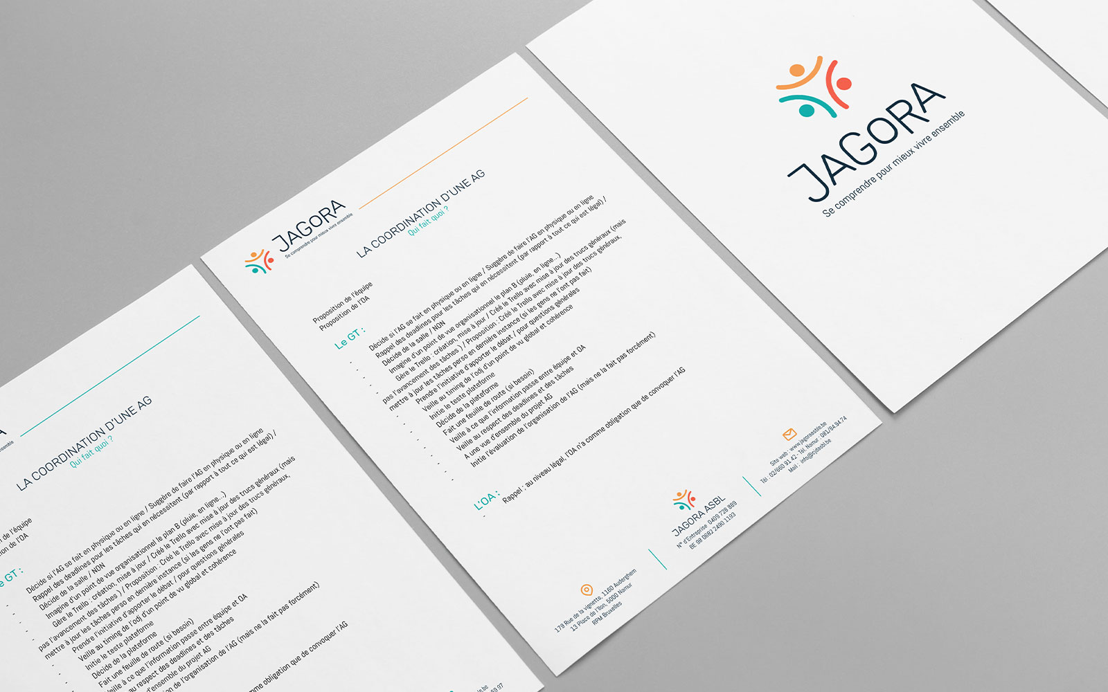 Après plusieurs années de collaboration avec le Conseil Jeunesse Développement, l’ASBL décide de demander à BL-Graphics de concevoir leur nouveau logo après leur changement de nom. Jagora ASBL est né et nécessite par conséquent une nouvelle identité visuelle, avec sa charte graphique et quelques dérivés comme l’en-tête de document ou des fiches outils.