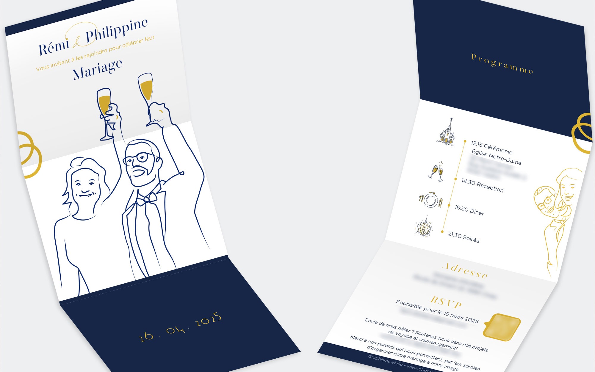 Invitation conçue par BL-Graphics pour le superbe mariage de Rémi & Philippine. Grâce à une chouette idée assez claire des clients, la conception de l’invitation a été très efficace et tout le monde en était tout de suite satisfait ! Un peu de signalétique simple et élégante a été conçue pour compléter la décoration du mariage.