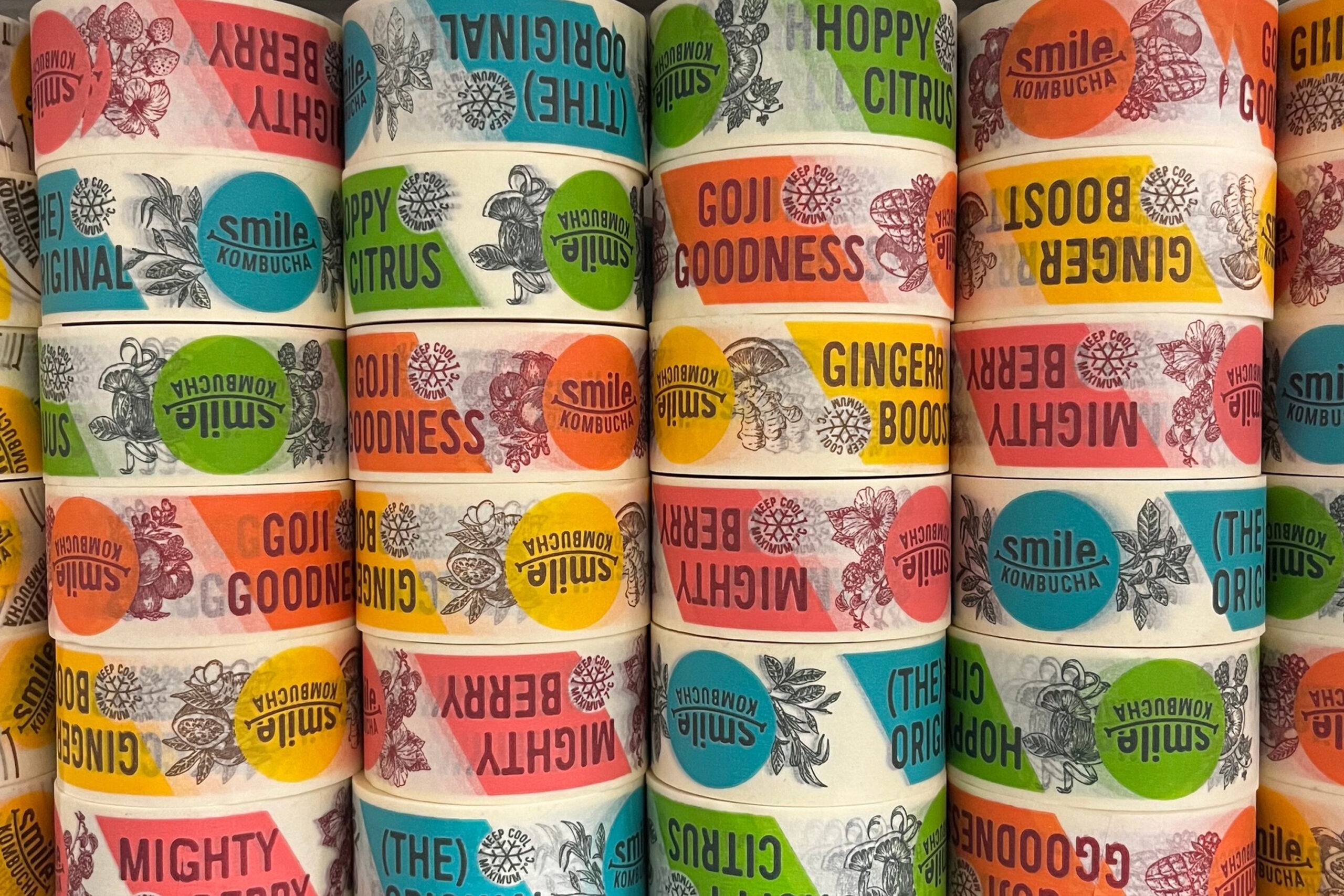 Viendront ensuite des caisses avec illustrations et des rouleaux de bande collante aux couleurs de chaque kombucha pour personnaliser et mieux organiser leur production.