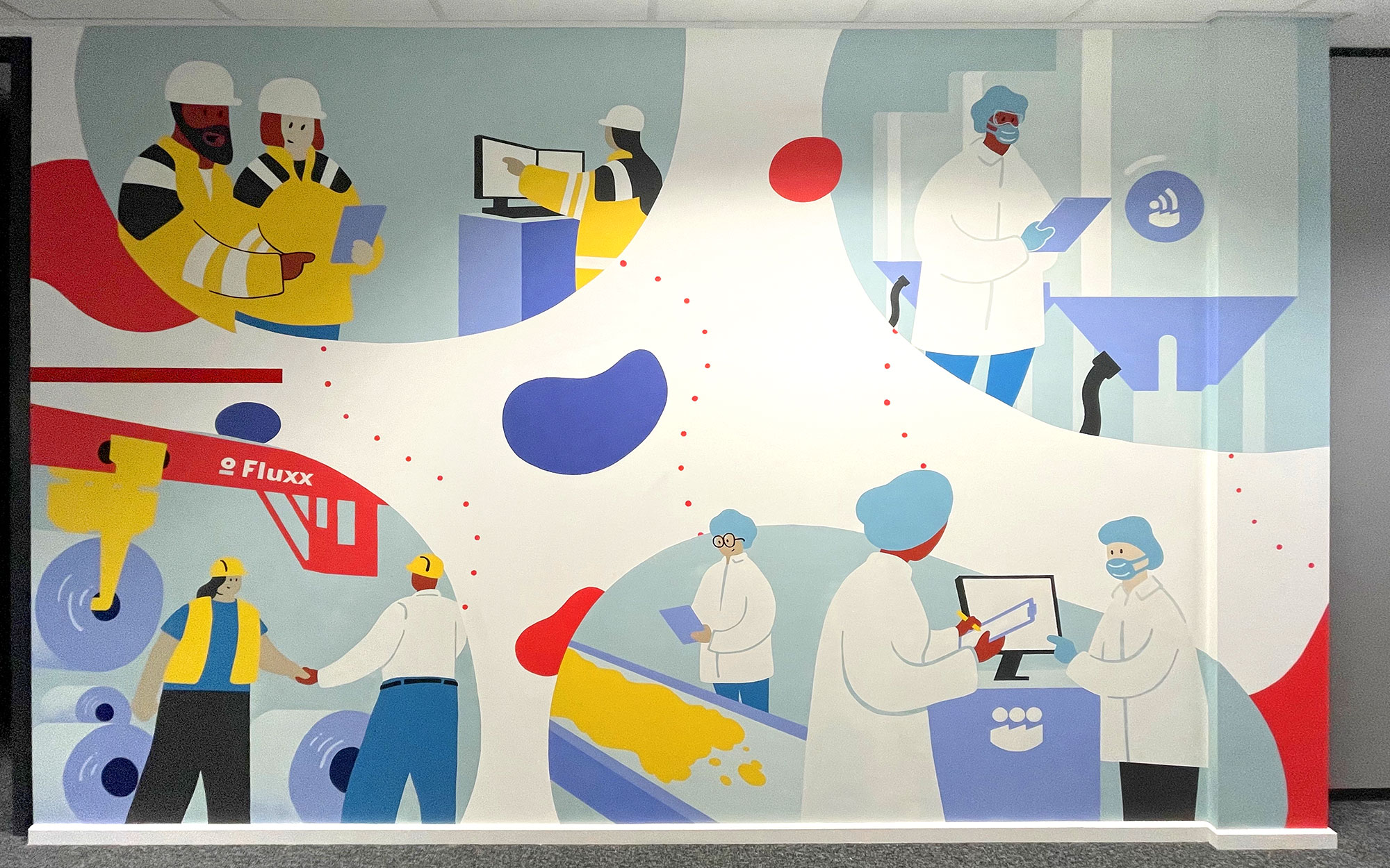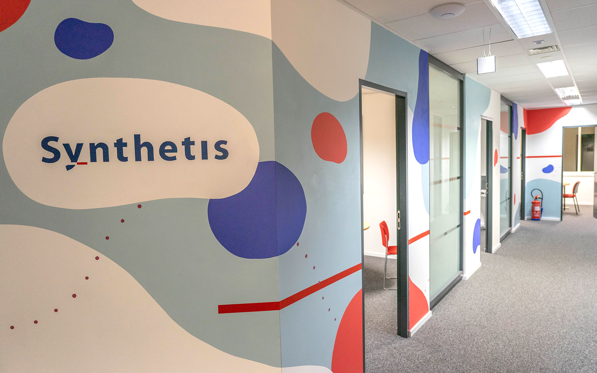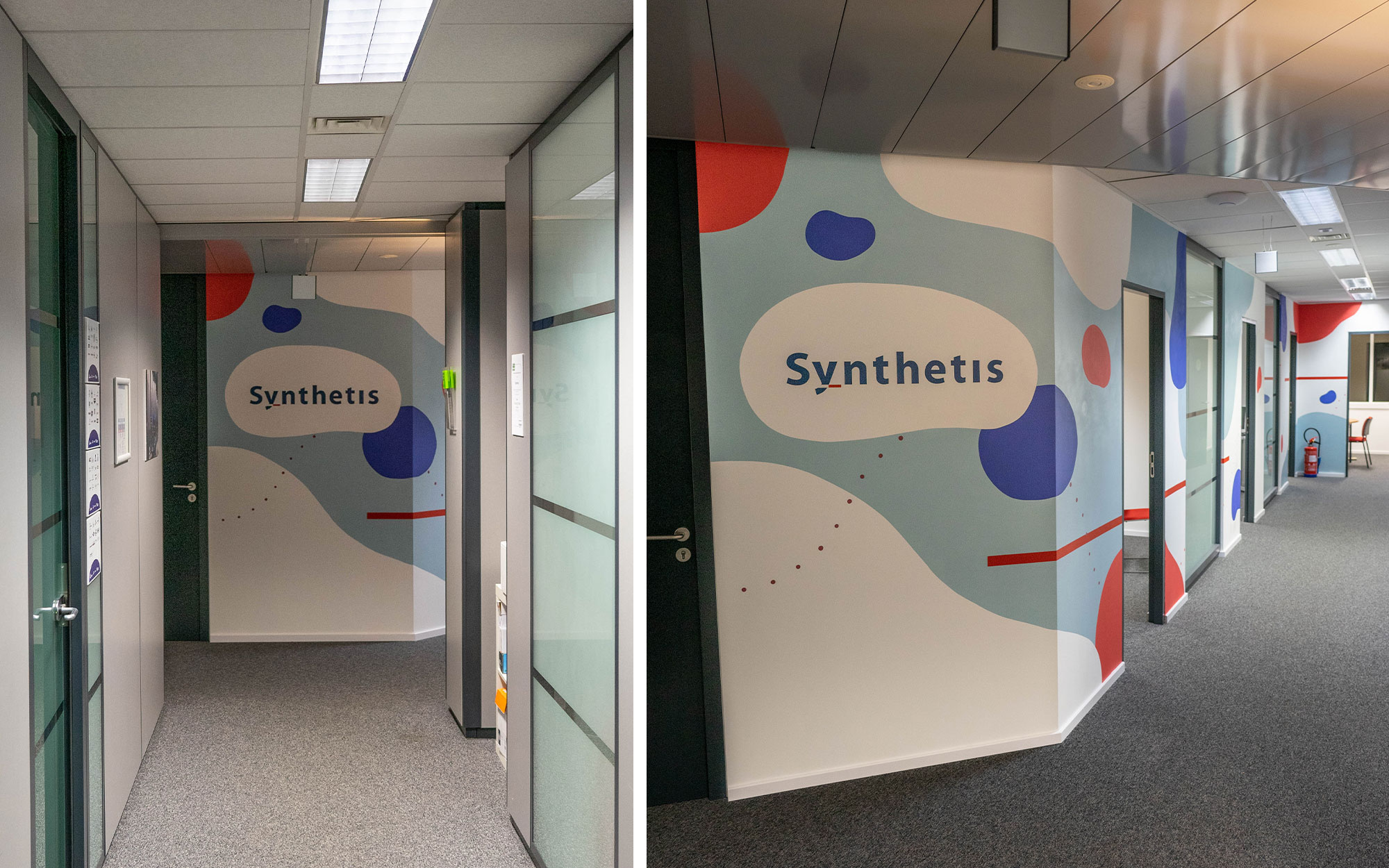 Synthetis a contacté BL-Graphics fin 2022 pour concevoir une fresque dans le cadre du rafraichissement de leurs bureaux à Louvain-la-Neuve. Nous avons donc conçu le design avec un logo à l’entrée et un cheminement dans tout le couloir jusqu’à un mur servant de pièce centrale, représentant différents milieux d’activités que l’entreprise accompagne.